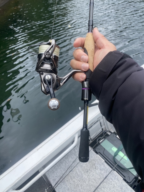 このロッド全体に曲がるので極小ワームのスキッピングがビシバシ決まります。ダム湖の表層系のノーシンカーには必須なロッドですね。