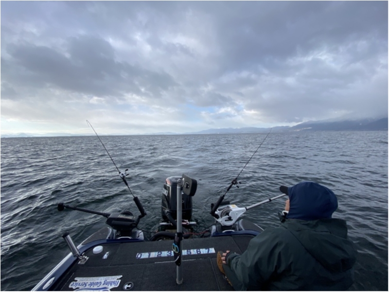 本日はビワマスガイド。ゲストさんの忘年会都合により13時終了という事なのですが、生憎、午前中が強風で、午後から風が止まるという展開。