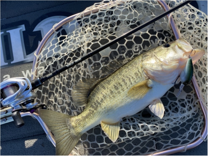 水深4mの南湖はウィードもボトム付近に生えて、ターンオーバーで濁るので、波動の強いクランク系への反応がすこぶる良い。ワイルドサイド73MLでぐりぐり巻いて、ウィードタッチで止めて浮かせるとコッ!ワーミングクランクと呼ばれるテクニックですが、このパターンで広大なウィードエリアから次々とバスが湧いてくる。
