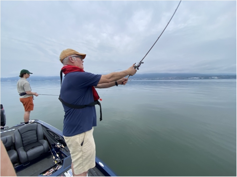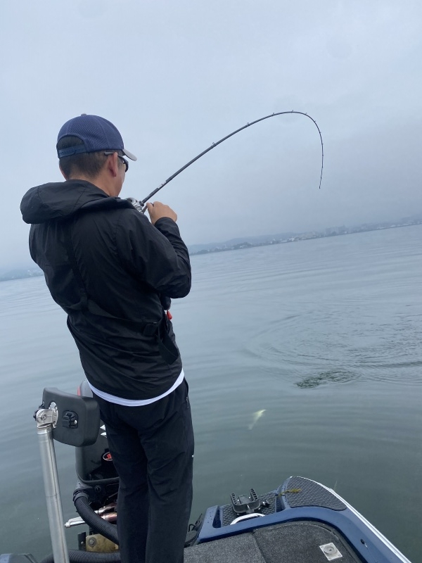 琵琶湖へ移動して朝7時スタート。メルボルンからのゲストさんでビギナーとおっしゃる通り、ベイトリールはバックラッシュのオンパレードでライン2回巻き替えたけど、結局ベイトリールは使えず。ワーム系の経験もほぼなく、ボトムにリグがつかないので、ノーシンカーで投げて放置してもらうだけの釣りに変更。