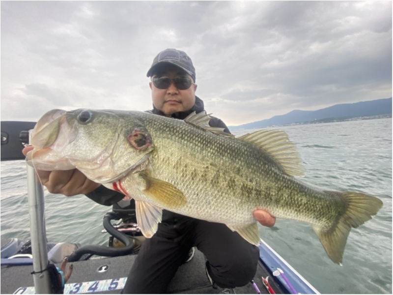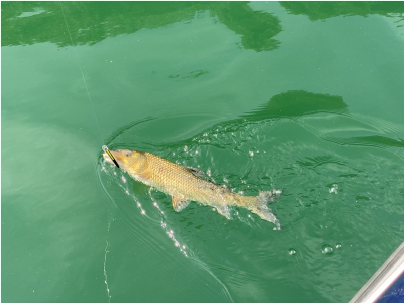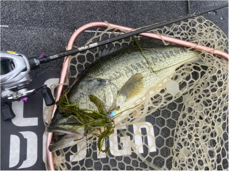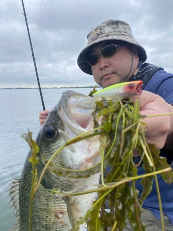 スピニングタックルだと、今度はランディングが初なので何本もラインぐブレイクされたり、潜られて藻化けしてしまうので、最後はウィードの無い場所を選んで、ヒット後にボートで沖へ出してドラグずるずるにしてキャッチしてもらいました。