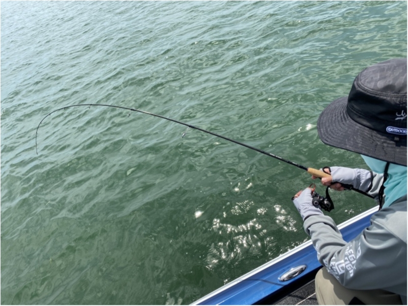 カバークローグランデは水中ボイル系ではテーブルターン。クイックなターンが欲しいからWSC63Mショートロッドと少し全体の張りがトゥィッチ時にバネのようにしなるモデルがおススメ。一方、エビモエリアではパワー重視なのでWSCST66Mのようなパワーロッドと使い分けた方が釣果が上がります。