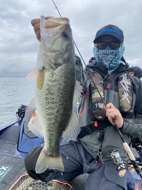 南湖からの出船。朝は昨日からの雨が残り小雨ローライトと釣れそうですが、レインウェアーでスタートするも、寒くて防寒着を取りに戻るレベル。午前のローライト時にボイルが発生してフローティングミノーにチェイスあり。とは言え、まだまだ本格的なボイルパターンには程遠い感じなので、雨が止んできたタイミングから手堅くフリックシェイクのネコリグ勝負で50アップ。続いてロクマルか?みたいな強烈な引きで、ゲストさんラインブレイクで前半戦終了。