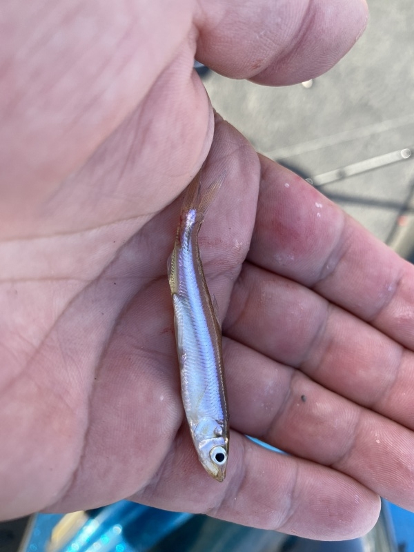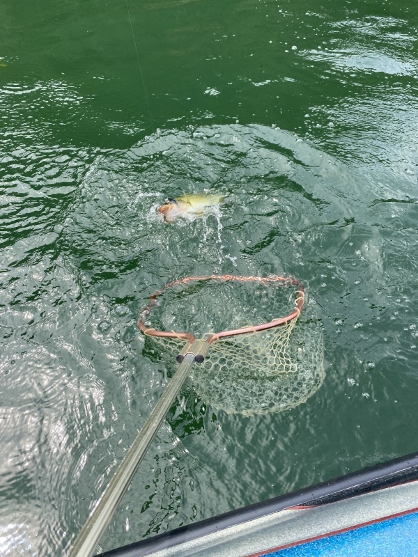 ワカサギパターンは相変わらずの見向きもしない感じなので、アユパターンにシフトして、レンジが下の方はフリックカーリーで、レンジが上の方はリルビル70Fで釣っていく。