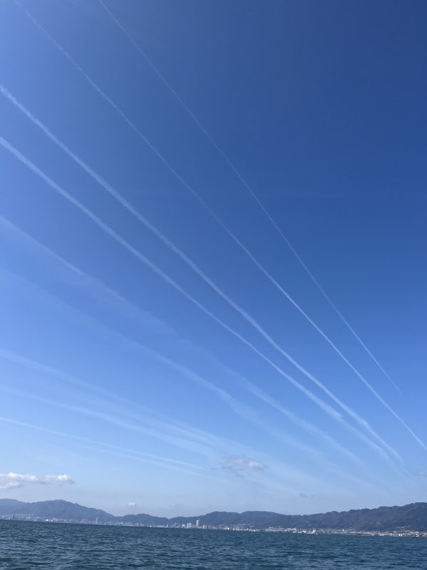 空にはたくさんの飛行機雲が。
